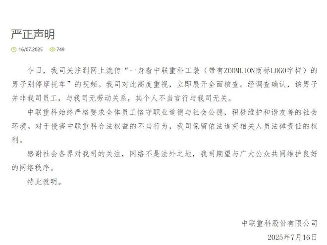 中联重科表示,关注到网上流传“一身着中联重科工装(带有ZOOMLION商标LOGO字样)的男子别停摩托车”的视频。公司对此高度重视,立即展开全面核查。“经调查确认,该男子并非我司员工,与我司无劳动关系,其个人不当言行与我司无关。”