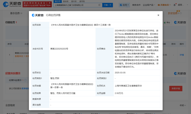 据报道,近日,张女士向记者反映,称她在爱康国宾健康体检管理集团有限公司设于北京的体检分院连续体检10年未被检出患癌风险,2024年被发现患癌时已是晚期,她质疑爱康国宾体检涉嫌“误检、漏检”。天眼查App显示,爱康国宾健康体检管理集团有限公司成立于2004年9月,法定代表人为李智,注册资本5000万人民币,经营范围包括医院管理、企业管理、健康咨询服务等,由爱康健康科技集团有限公司全资持股。周边风险信息显示,爱康国宾旗下多家公司均曾涉及医疗纠纷。值得注意的是,2023年5月,北京爱康国宾西内门诊部有限公司曾因买卖合同纠纷被起诉,原告诉称要求支付体检费138元、支付体检漏检致使不能及时休息治疗反而入职上班造成的损失15万。2025年3月,上海爱康国宾外之滩门诊部有限公司因纸质体检报告中无已检查的项目内容,存在执行《病历书写基本规范》、体检报告质量管理制度时未落实的情况,被上海市黄浦区卫生健康委员会罚款2万。