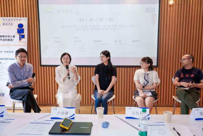 在活动的圆桌对话环节,黄胜利、胡思珏、卢玮静、北京慈弘慈善基金会项目总监顾雅婷和多阅公益理事长周洋就“如何用多方力量构建一个促进乡村孩子阅读与成长的教育公益生态”展开讨论。