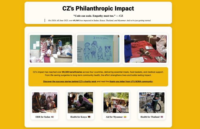慈善也是赵长鹏对外宣传的重心。7 月 14 日晚,他专门在 X 上分享了他出狱以来的个人慈善动作,称自去年 10 月至今,苏丹、肯尼亚、泰国和缅甸等国已有超 6.94 万人受益。他专门建立了一个网站 czcharity.com,意为“CZ 的慈善”。网站列举了赵长鹏在苏丹抗击饥荒,在肯尼亚建立儿童之家抵御结核病、在缅甸和泰国帮助难民等慈善动作,标题是“CZ's Philanthropic Impact”(CZ 的慈善影响力)。