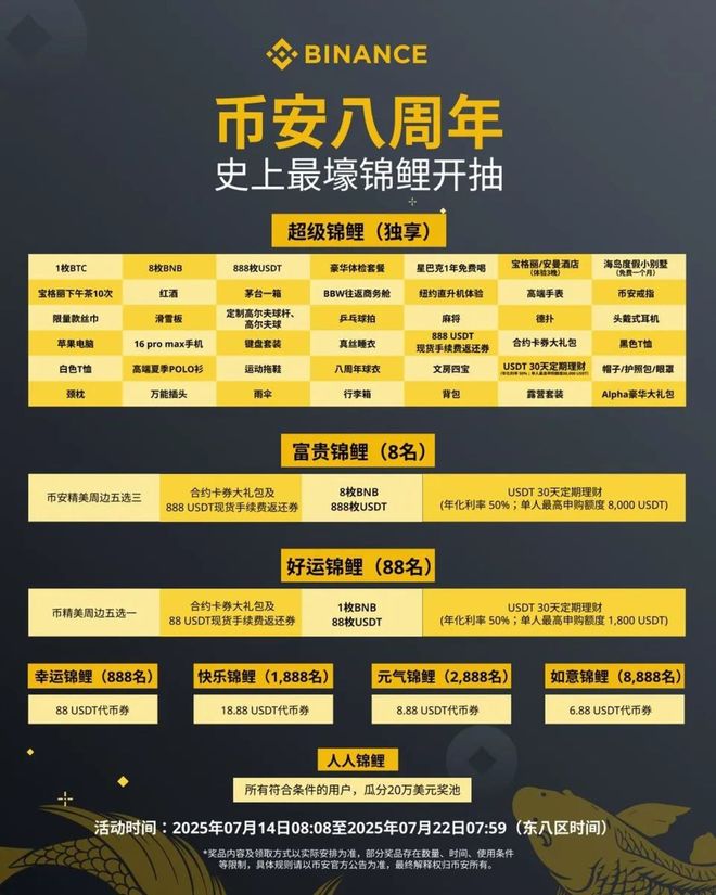 7 月 14 日,恰好也是币安成立 8 周年的日子。他们专门拍摄了宣传片,“我们一起将梦想变成了现实。”币安为此还举办了一个名为“寻找币安超级锦鲤”的庆祝活动,最高奖品包括 1 枚比特币、8 枚 BNB、888 枚 USDT 以及星巴克一年免费喝、一箱茅台以及一个月的海岛度假别墅等,奖品总计金额或超 30 万美元。