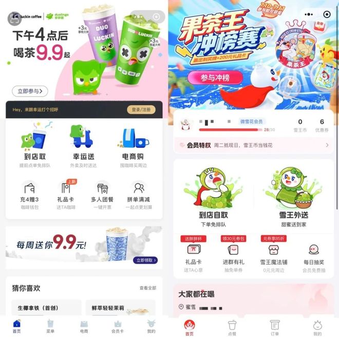 瑞幸、蜜雪冰城的小程序在功能和活动上都已经非常丰富