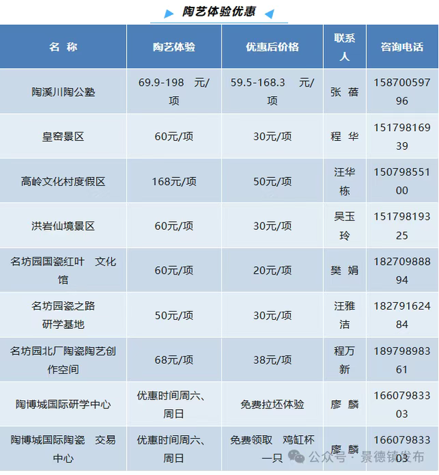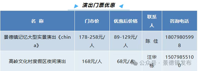 本人可享受每家景区门票优惠各1次,享受每项陶艺体验优惠各1次,享受演出门票优惠各1次。具体如下: