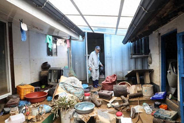 当地时间2025年7月18日,韩国忠清南道礼山郡,一名居民查看被暴雨损毁的房屋。视觉中国 图