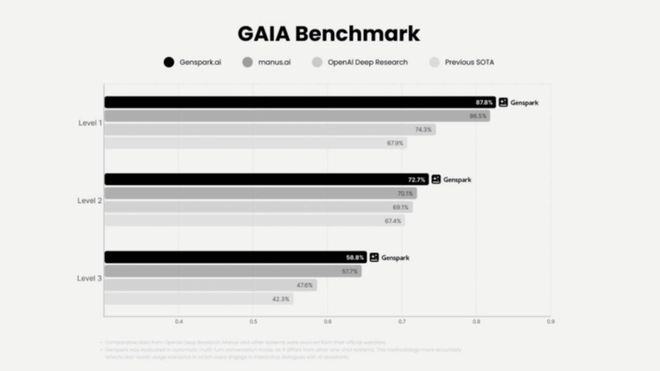 在GAIA基准测试中,Genspark在多个级别上也取得了优异的成绩,表现甚至优于Manus和OpenAI Deep Research,更重要的是,Genspark还有中文版本。