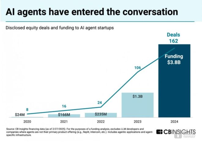 智能体狂热背后,有市场炒作的原因,风口来临之际,谁都想争抢先机。CB Insights数据显示,2024年智能体初创公司共完成投融资38亿美元,同比增长了3倍。