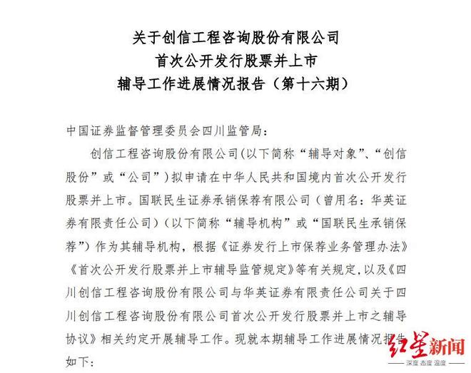 微成都报道近日,新三板挂牌公司创信工程咨询股份有限公司(简称“创信股份”,838536)披露关于首次公开发行股票并上市辅导工作进展报告(第十六期),拟在深交所创业板上市,辅导机构为国联民生承销保荐。