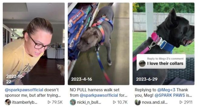 Spark Paws、Ruffwear等品牌就喜欢在各大平台建立社交账号矩阵,并合作粉丝体量不大、性价比高的中腰部KOC,其中Spark Paws合作了大量粉丝量5000-3万左右的TikTok、Instagram、Pinterest网红,拍摄以探店、日常穿搭、人宠互动为主的低成本、趣味性内容。