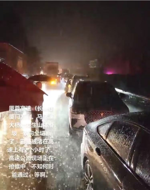 该车主表示,到现在有车主已经被堵十多个小时,“我当时在高速路上被困了两个多小时,我最后就掉头,从长泰到厦门,再到长泰,30公里的路走了3个小时。有网友说走324国道去厦门也有部分路段塌方被困在路上。”