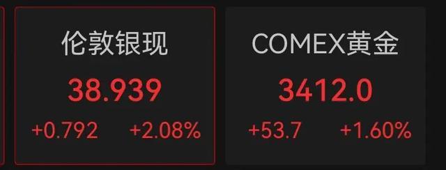 此外,COMEX期货黄金涨1.6%,报3412美元/盎司。现货白银涨幅也扩大至2%,报38.939美元/盎司。