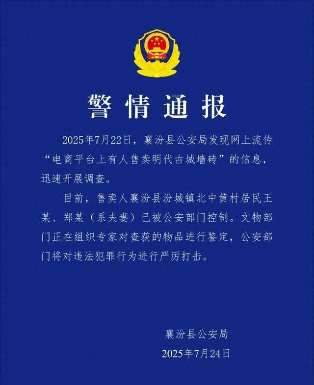 7月22日,襄汾县公安局发现网上流传“电商平台上有人售卖明代古城墙砖”的信息,迅速开展调查。