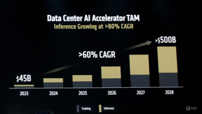 今年6月,AMD CEO苏姿丰(Lisa Su)表示,去年AMD预测,到2028年,全球数据中心 AI 加速芯片规模达到5000亿美元,年增长速度超过60%。而如今随着推理模型的兴起,这个数字甚至更高。