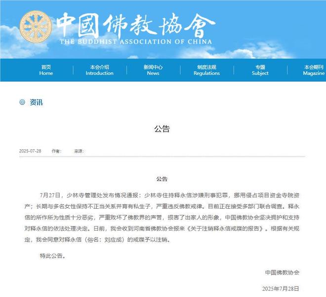少林寺住持释永信涉嫌刑事犯罪,中国佛教协会发声,发声内容曝出
