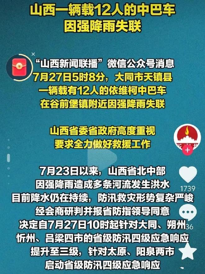 2025年7月下旬的山西,被一场持续的强降雨笼罩。北中部地区的雨势从7月23日起就没歇过,多条河流涨水,防汛的弦越绷越紧。而在7月27日凌晨5时8分,大同市天镇县谷前堡镇附近,一辆载着12人的依维柯中巴车,在暴雨引发的积水与混沌中失去了消息,像被这场极端天气吞噬的一个符号,牵动起无数人的心。