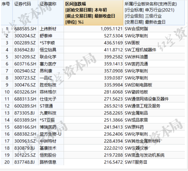 位居第六到第十的依次是塞力医疗(603716.SH)、昂利康(002940.SZ)、一品红(300723.SZ)、胜宏科技(300476.SZ)、菲林格尔(603226.SH),分别布局医疗流通、化学制剂、印刷电路板、瓷砖地板等板块,年内涨幅在281%至360%不等。