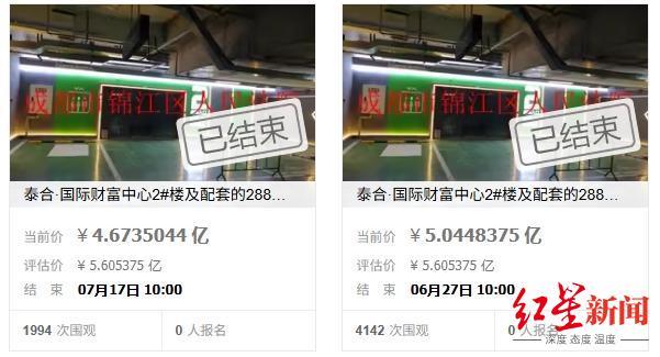 2023年,一则名为“泰合·国际财富中心2#楼及配套的288个产权车位”的标的在阿里资产司法拍卖平台挂牌,评估价为5.61亿元。