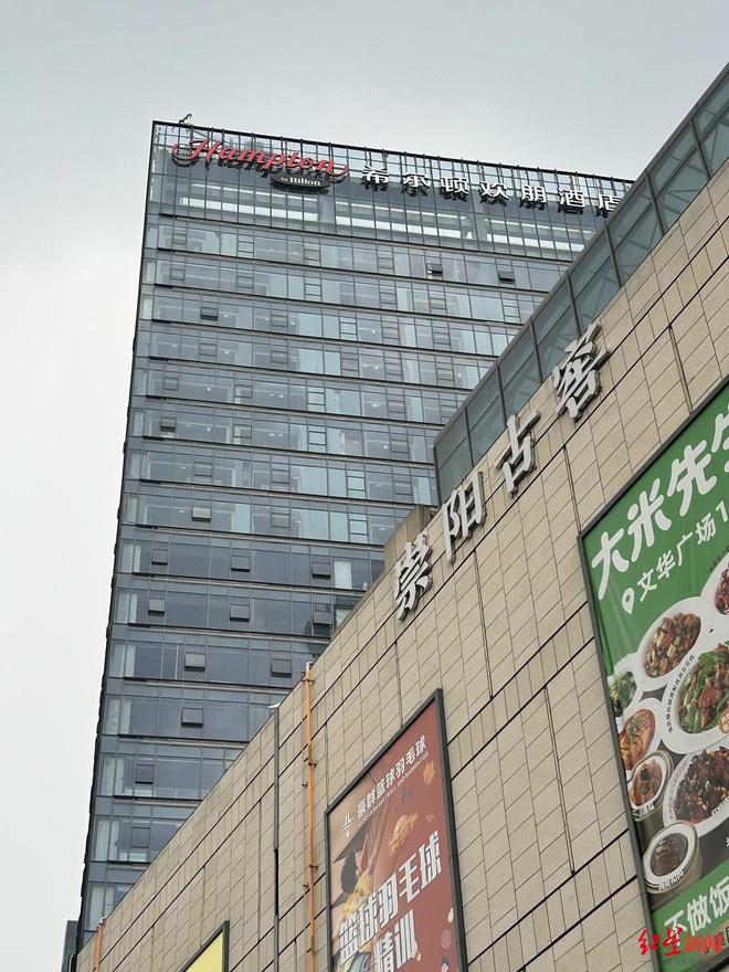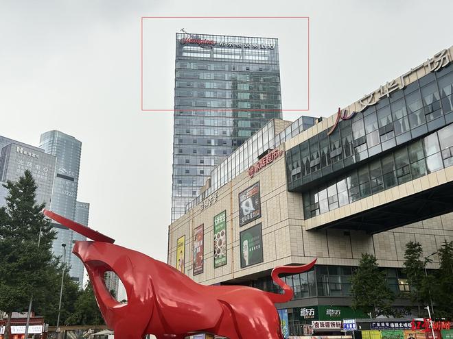 ▲成都文华广场旁的塔楼(图中用红框圈出),已挂上“希尔顿欢朋酒店”的招牌。符小茵/摄