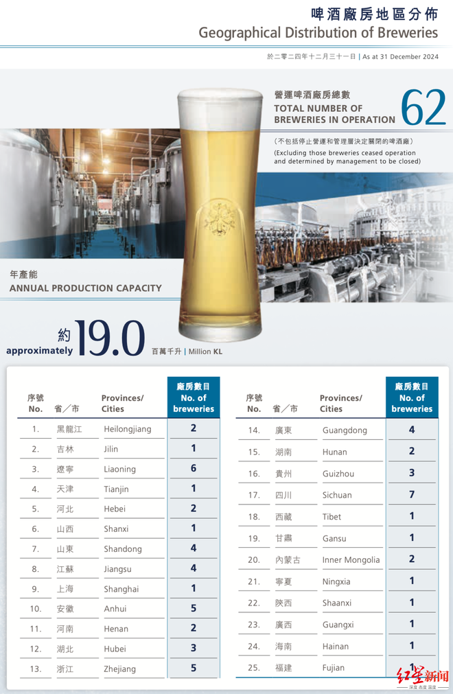 红星资本局查询华润啤酒2024年年报,报告期内,其工厂数量为62家。对比其2021年底的65家啤酒厂,也就是近三年又关闭3家啤酒工厂。据华润啤酒2021年报,为推动优化产能布局,于2021年内已停止营运5家啤酒厂。