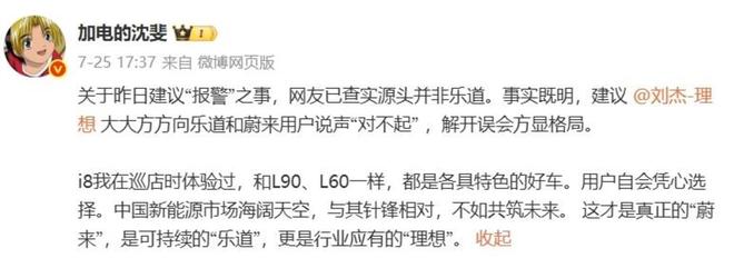 7月25日下午,蔚来高级副总裁、乐道总裁沈斐在微博称网友已查实此事源头并非乐道,喊话刘杰“大大方方向乐道和蔚来用户说声‘对不起’,解开误会方显格局。”