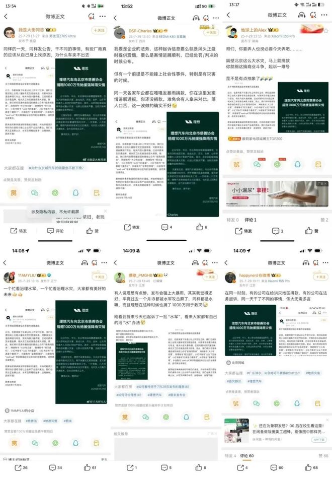 更“魔幻”的是:就在理想i8发布会当天,蔚来法务部微博发布《关于网络恶意造谣水军案件进展通报》,紧接着,理想汽车微博宣布向北京市慈善协会捐赠1000万元驰援强降雨灾情;此后有多个微博账号对蔚来法务部的通报和理想汽车捐款的内容进行拼图类比,在同一时间段密集发布,对蔚来汽车进行相似的指责,大意是“在同一天,理想在给洪灾地区捐款,蔚来在发法务通告,蔚来没有格局”。这件事情俨然发展成了一场品牌之间拉踩的“公关战”。