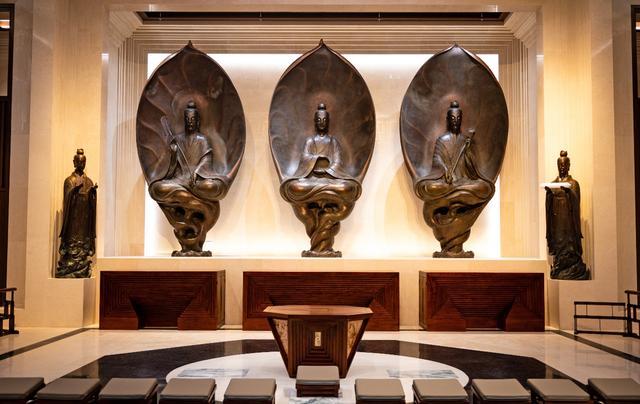 除四座“石室”主体建筑外,部分墙面装饰采用锡青铜格栅及铜皮。这一做法借鉴了江南地区传统庙宇的门窗与木隔断形式,但以更为利落、整洁且持久的面层效果呈现。