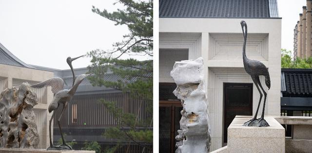 在好友顾默修的协助下,鹤坡观于三清殿前两侧选置了一对形态极具神韵的太湖石双峰。 这取义日月的双峰,烘托着大殿法台上象征昆仑的博山香炉——它居于天地中央。太湖石前方植有四株劲松,与湖石相得益彰。松树的选苗与栽植,全赖另一位好友李昕的多次精心挑选。李昕师承扬州治园名家方惠先生,松树下的叠石也出自伊手。由此,奇石、古松与月台上的瑞鹤(解群作品)共同构成了“鹤沙福地”的意象。