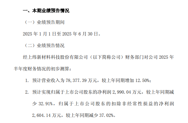 8月4日晚间,上纬新材发布业绩预告称,预计2025年上半年的营业收入为7.84亿元,同比增长12.50%;归母净利润为2990.04万元,同比下降32.91%;扣非后净利润为2604.14万元,同比下降37.02%。