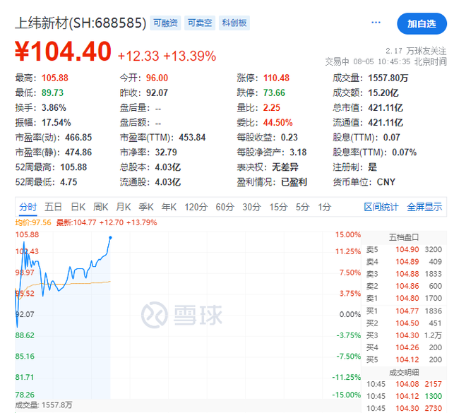 红星资本局8月5日消息,上纬新材(688585.SH)复牌再度大涨,截至10时45分,该股拉升涨超13%,股价突破100元,最新市值421亿元。