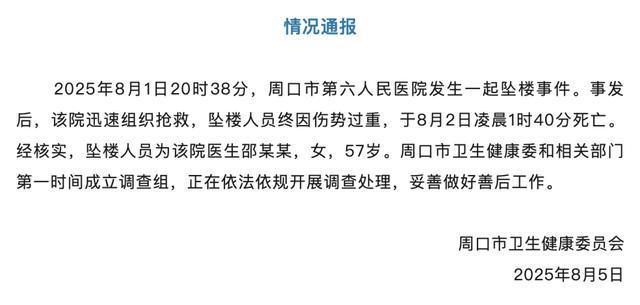 2025年8月1日20时38分,周口市第六人民医院发生一起坠楼事件。事发后,该院迅速组织抢救,坠楼人员终因伤势过重,于8月2日凌晨1时40分死亡。经核实,坠楼人员为该院医生邵某某,女,57岁。周口市卫生健康委和相关部门第一时间成立调查组,正在依法依规开展调查处理,妥善做好善后工作。