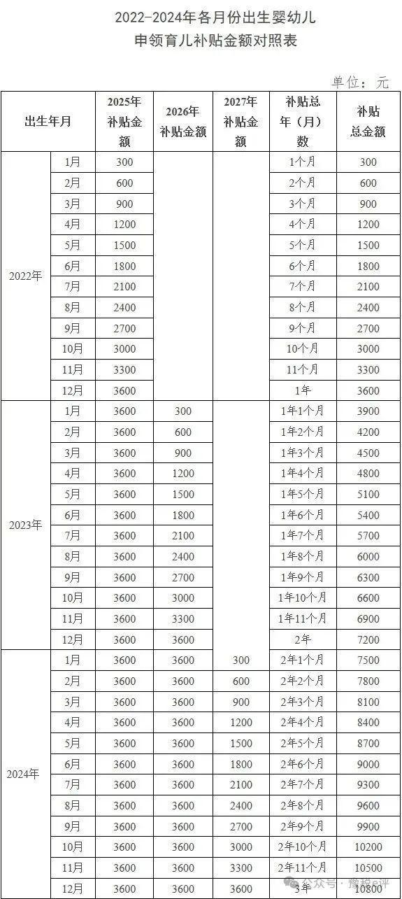 2022-2024年各月份出生婴幼儿申领育儿补贴金额对照表