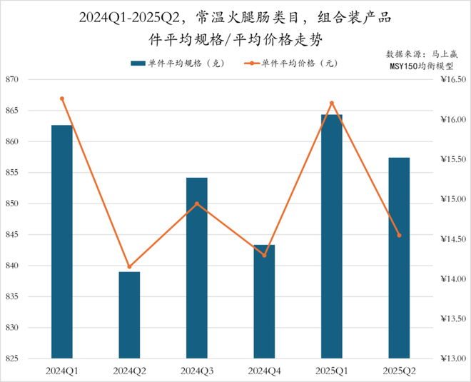 常温火腿肠组合装产品的件均规格与件均价在2024Q1至2025Q2期间呈现出明显的同步波动特征。件均规格呈现出Q1与Q3小幅上升、Q2与Q4略有回落的规律;件均价波动更为明显,2024Q2与2024Q4处于低点,而2024Q1和2025Q1则达到16.5元,为同期高位。2025Q2规格缩减幅度较小,而价格则大幅下调超2元,企业或通过价格手段提振销量。