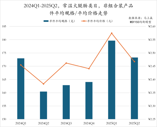 从非组合装产品的规格与价格走势来看,2024Q1至2025Q2,常温火腿肠类目件均规格在2024Q2的大幅缩减后,连续两个季度小幅回升,2025Q1反弹至180g高位,2025Q2则回落至173g,回到2024Q1水平。而件均价则在2024Q2触及低点2.38元后波动提升,2025Q1达到2.57元,随后略有回调。