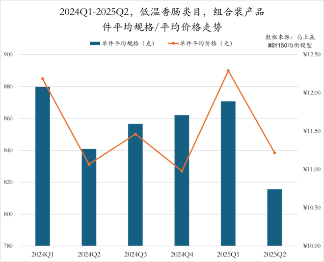 2024Q1至2025Q2,低温香肠类目组合装产品的件均规格在2024Q1达到880克的高位后,在2024Q2出现明显缩减,随后小幅回升,2025Q1提升至870克,但2025Q2骤降至820克,为近六个季度最低水平。在件均价格则波动更加明显,2024Q1为12元,2024Q2有所下降,随后两个季度小幅波动,2025Q1价格大幅上涨至近六个季度峰值,但2025Q2再次回落至11元。总体来看,2025Q2低温香肠类目规格缩减明显,价格有所回落,或与节后消费回落,企业通过减价缩量应对市场竞争相关。