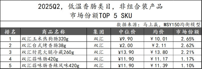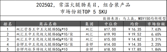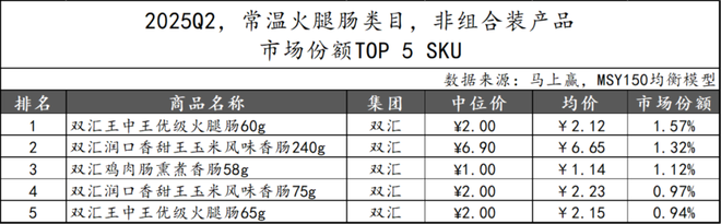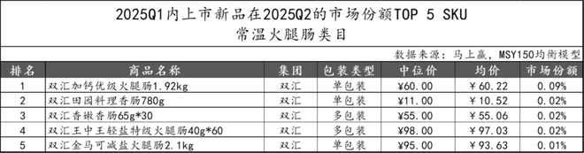 2025Q1上市的常温火腿肠新品在2025Q2的市场份额TOP 5 SKU中,双汇集团包揽全部席位,显示其在新品布局上的高度集中与品牌统治力。其中,“加钙优级火腿肠1.92kg”位居第一,表现相对突出,显示出大规格营养强化型产品在细分市场的潜力。