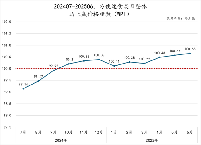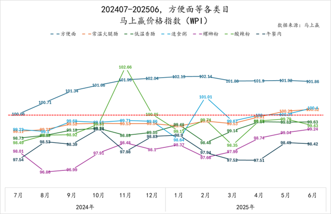 从2024年7月至2025年6月各类目的马上赢价格指数(WPI)走势来看,方便速食各类目间价格分化加剧。