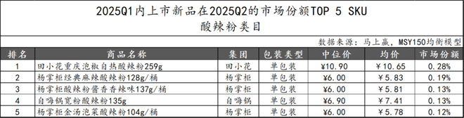 2025Q1上市的酸辣粉类新品在2025Q2的表现中,田小花的“重庆泡椒自热酸辣粉”凭借大规格特点领先。杨掌柜共有三款产品上榜,包含不同风味和规格,体现出一定的产品多样化尝试。自嗨锅的宽粉酸辣粉同样跻身第四。值得注意的是,酸辣粉类目2025Q1新品在2025Q2的市场份额TOP 5 SKU均为非CR5成员,可见酸辣粉市场竞争激烈,非CR5集团推新意愿强。