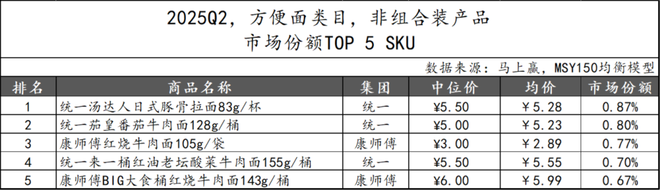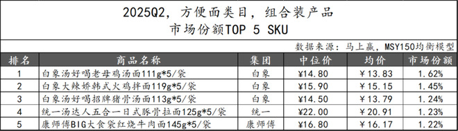 基于2025Q2方便面类目的市场份额TOP 5 SKU情况可以看到,非组合装产品中,统一集团继续保持强势,凭借多款产品占据三席,涵盖杯装、桶装等不同规格,展现出较强的产品布局能力。其中“汤达人”与“茄皇”系列位列前二。康师傅则凭借经典袋装产品和“BIG”桶装产品占据第三与第五,继续发挥其在大众消费层的品牌影响力。