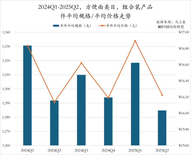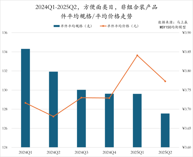 2024Q1至2025Q2,方便面非组合装产品的件均价呈现出波动态势。件均价在2024Q1至Q4间基本维持在3.7元左右的小幅波动,至2025Q1小幅上扬至3.84元后,2025Q2略有回调至3.77元。与此同时,件均规格则呈现出持续缩减趋势,从2024Q1的134g下降至2025Q2的128g。整体来看,产品规格“瘦身”趋势明显,企业或通过规格缩减将产品进一步精致化,从而获得价格上的增长,推动整体销售规模增长。
