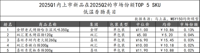 2025Q1上市的低温香肠新品在2025Q2市场份额TOP 5 SKU中,产品风格多样。金锣推出的“老式烤肠哈尔滨风味350g”位列第一,或是地域风味产品存在一定吸引力。双汇和喜旺各有两款产品上榜,涵盖口味和规格丰富。整体来看,头部品牌在新品市场仍保持较高活跃度,而非CR5成员喜旺亦有突破。