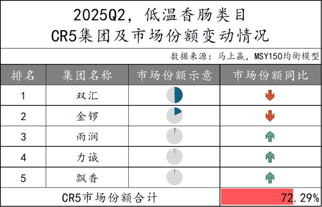 2025Q2低温香肠类目的CR5集团市场份额合计为72.29%,相比其他类目市场集中度相对较小。在头部格局方面,双汇和金锣依旧保持前两名的位置,但二者的市场份额同比均出现下滑态势,而雨润则呈现上升态势。同时,力诚和飘香更是取代上一季度的得利斯和喜旺跻身CR5,市场份额也同比增长。
