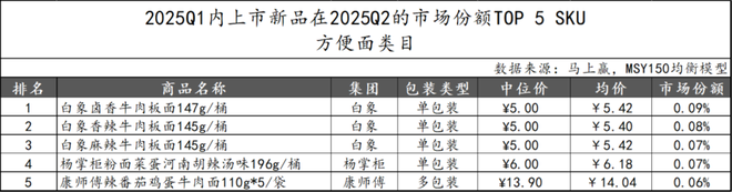 2025Q1上市的方便面类目新品在2025Q2市场份额TOP 5 SKU中,白象集团的三款牛肉板面产品包揽前三,或是紧跟板面产品在互联网热度的发力初见成效。杨掌柜凭借河南胡辣汤味的粉面菜蛋产品跻身第四,康师傅则是以多包装产品位列第五。整体来看,CR5集团在新品投放上仍占据主导,其余品牌或可通过独特风味抢占消费者认知与接受度。