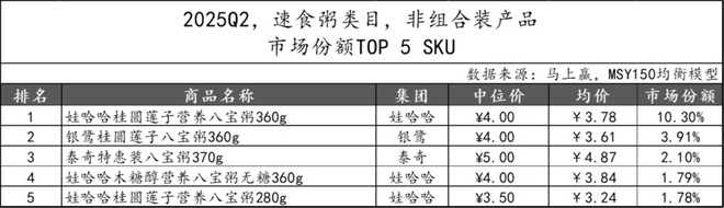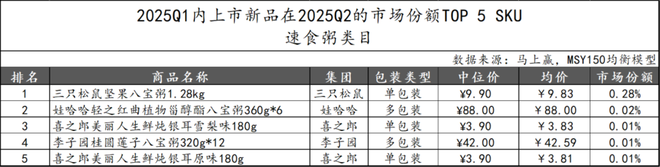2025Q1上市的速食粥类新品在2025Q2市场份额普遍较低。三只松鼠的“坚果八宝粥1.28kg”是新品中表现最为突出的单品,娃哈哈集团的多包装产品“轻之红曲植物甾醇酯八宝粥”凭借健康、养生特点位列第二。其余三款产品归属喜之郎和李子园集团。值得关注的是,新品TOP 5 SKU中,仅有娃哈哈为CR5成员,显示速食粥类目非CR5集团正通过差异化口味和健康化产品提升市场竞争力。