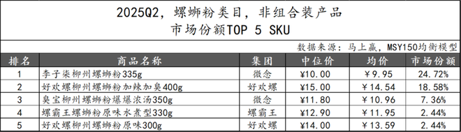 2025Q2,螺蛳粉类目非组合装产品的市场份额TOP 5 SKU继续呈现高度集中态势,头部品牌合计占比超过55%。其中,微念集团与好欢螺集团各有两款产品上榜,“李子柒柳州螺蛳粉 335g”以24.72%的市场份额稳居第一,延续其在该品类中的绝对领先地位。好欢螺的“加辣加臭”产品位列第二,彰显其差异化口味策略的有效性。螺霸王则凭借原味水煮型产品跻身第四。整体来看,螺蛳粉市场呈现“强者恒强”的格局。