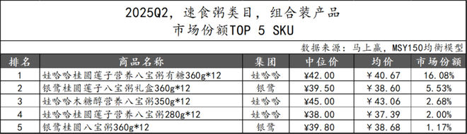 2025Q2,速食粥类目的组合装产品市场份额TOP 5 SKU由娃哈哈与银鹭两大集团包揽。娃哈哈共有三款产品上榜,其“桂圆莲子营养八宝粥”更是以超16%的市场份额位居第一,银鹭则凭借两款桂圆莲子系列产品位列第二和第五。整体来看,速食粥组合装市场集中度较高,TOP 5 SKU市场份额合计占比超27%,头部品牌展现出强势竞争力。