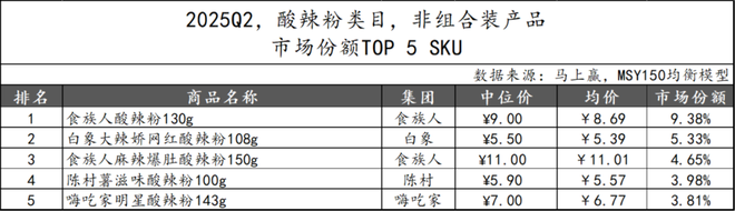2025Q2,酸辣粉类目非组合装产品中,市场份额TOP 5 SKU由CR5集团中的食族人、白象、陈村和嗨吃家占据,头部品牌格局基本延续。食族人继续凭借“经典酸辣粉”和“麻辣爆肚酸辣粉”两款产品,以总计超过14%的市场份额领跑类目。白象则依托“大辣娇”系列以亲民定价切入主流消费群体。陈村与嗨吃家亦分别以高性价比与网红特色打入榜单。
