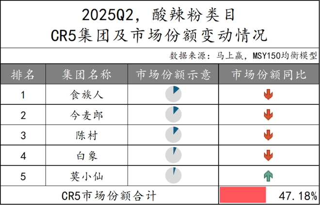 酸辣粉类目CR5集团市场份额合计47.18%,市场集中度较低,市场竞争呈现出分散化的趋势。从市场份额的同比变化情况来看,仅有莫小仙的市场份额有所增长,其余四个集团均呈下降态势。在头部集中度可能进一步下降的背景下,新兴玩家或许能够通过差异化定位获得更多的竞争空间。