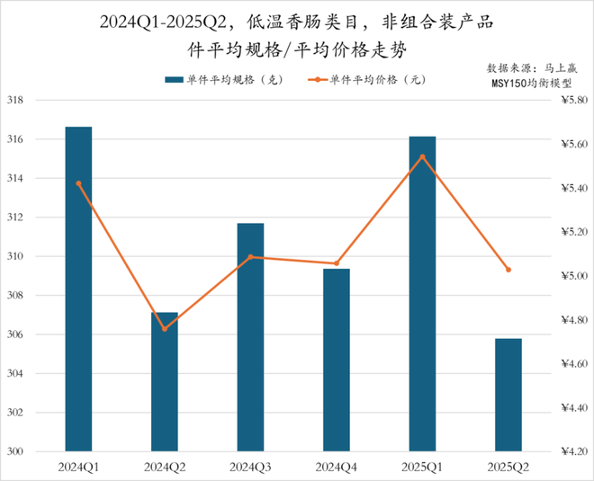近六个季度来看,低温香肠类目非组合装产品的件均规格与件均价呈现出一定的同步波动特征。2024Q1件均规格达317g,均价为5.42元,随后两个季度价格与规格均有所下调,或与节后需求走弱、市场促销加剧有关。此后规格与价格小幅回升,至2025Q1规格回到316g、件均价升至5.54元。2025Q2价格与规格再度双双回落,显示出淡旺季对消费节奏的影响仍较明显。