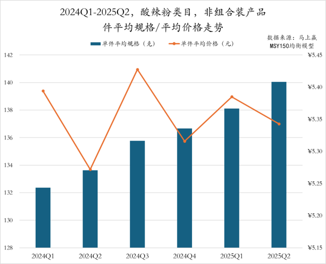2024Q1至2025Q2,酸辣粉类目非组合装产品的件均规格稳步上升,从2024Q1的132g持续增长至2025Q2的140g,产品不断升级以满足消费者对容量的需求。件均价则波动变化,2024Q2降至最低,随后反弹至2025Q1的5.40元,2025Q2略微回落但相对稳定。总体来看,酸辣粉类目非组合装产品在规格提升的背景下,价格调整趋于稳健。