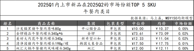 2025Q1上市的新品在2025Q2的市场份额TOP 5 SKU中,雪海梅香的“沙发猫黑猪午餐肉原味80g”以0.05%的市场份额领跑,体现了小包装单品在细分市场的认可。金锣以多包装产品“精品午餐肉罐头340g*6”跻身第二,新希望六和、美好、韩国大象食品及双汇的新品均为单包装,均价区间在10元至18元之间,价格策略相对统一。整体来看,午餐肉新品市场竞争激烈,头部品牌掌握一定优势的同时,其余品牌或可通过小规格产品实现份额增长。