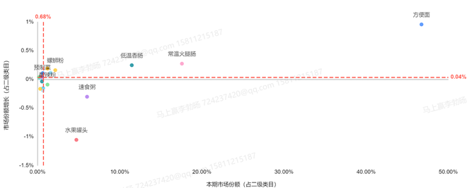 基于市场份额和销售额的同比变动分析,2025Q2方便速食类目整体呈现“结构稳定、增长承压”的态势。方便面、常温火腿肠和低温香肠三大主力品类市场份额均实现同比提升,但销售额却出现8%-9%的显著下滑,反映出头部品类即便份额上升,但在销售额上依然面临价格或动销的压力。